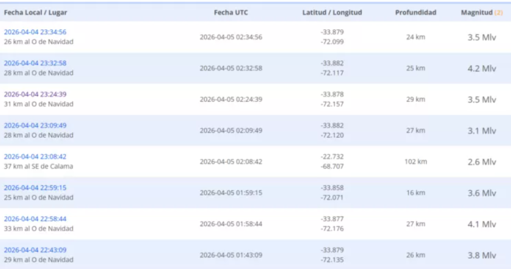 Una inquietante seguidilla de movimientos telúricos se registró la noche de este sábado en la comuna de Navidad, en la región de O’Higgins, donde vecinos percibieron múltiples sismos en un corto periodo de tiempo.