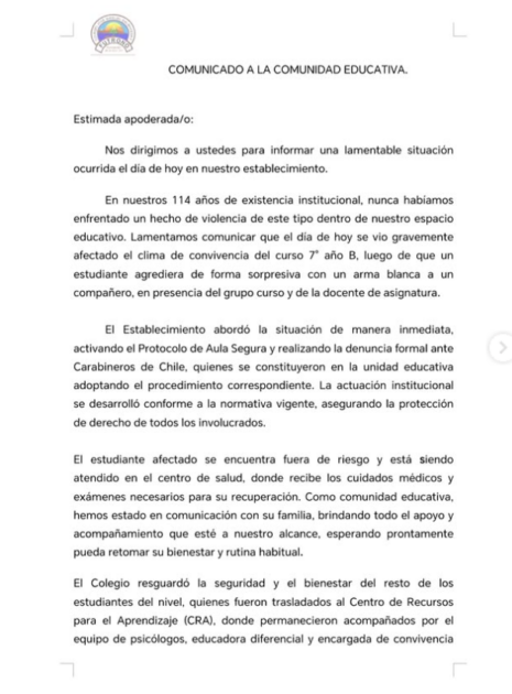 Y continuaron: “Lamentamos comunicar que el día de hoy se vio gravemente afectado el clima de convivencia del curso 7º año B, luego de que un estudiante agrediera de forma sorpresiva con un arma blanca a un compañero, en presencia del grupo curso y de la docente de asignatura”.