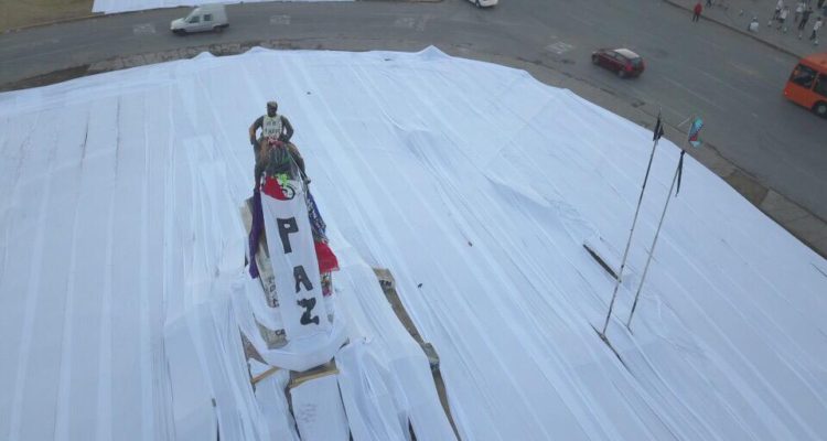 Finalmente, se colgó un lienzo que dice “Paz” en el monumento al general Manuel Baquedano.