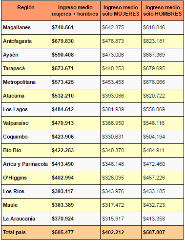 La región del país con mayores ingresos es Magallanes ($740.561 promedio), seguida por antofagasta ($679.830) y Aysén ($590.408).
