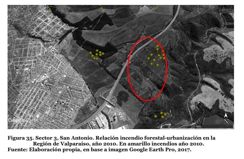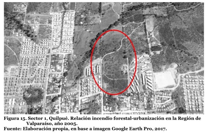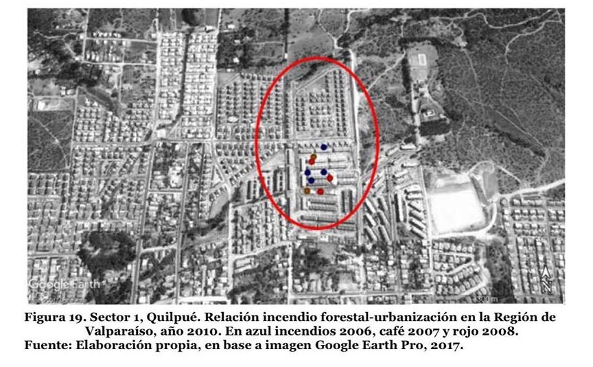 El escrito, y a través de imágenes que lo comprueban,lo ejemplifica con un sector en Quilpué, que sufrió por el fuego en 2006, 2007, 2008, y que fue urbanizado completamente en 2010.
