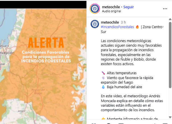 Según señaló el experto Andrés Moncada, de la Dirección Meteorológica de Chile, “las condiciones meteorológicas actuales siguen siendo muy favorables para la propagación de incendios forestales, especialmente en las regiones de Ñuble y Biobío, donde existen focos activos”.
