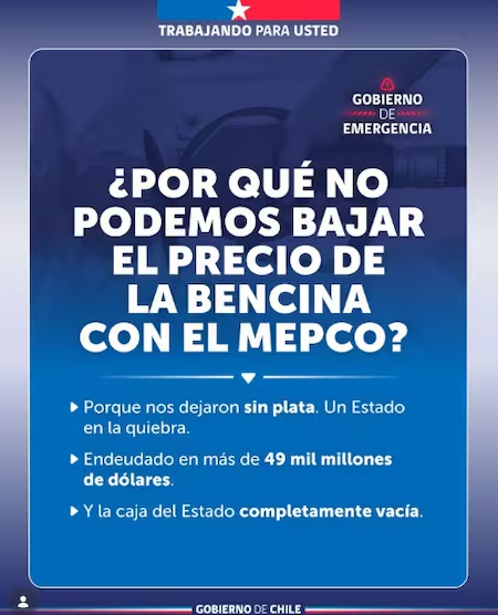 “¿Por qué no podemos bajar el precio de las bencinas con el Mepco?”, parte señalando el escrito. Inmediatamente, en la misma gráfica, exponen: “Porque nos dejaron sin plata. Un Estado en la quiebra”, señalaron desde el Gobierno.