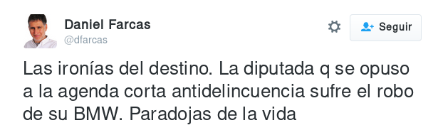 El diputado PPD, Daniel Farcas, tras conocer las primeras versiones de prensa, aprovechó la oportunidad para criticar a la diputada por oponerse a la ley corta y ahora sufrir el robo de “su BMW”.