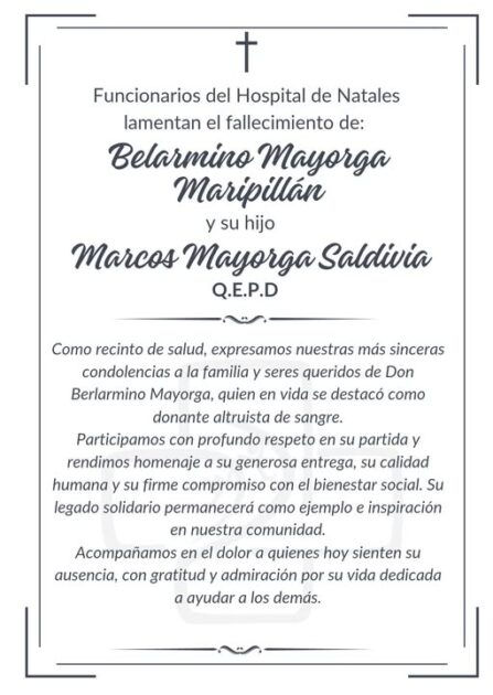 “Como recinto de salud, y especialmente desde nuestra Unidad de Medicina Transfusional, lamentamos profundamente el fallecimiento de Don Belarmino Mayorga y de su hijo. D. Belarmino en vida fue un valioso donante altruista de sangre”.