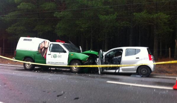 El hecho se registró pasadas las 9 horas a la altura del kilómetro 100 de la ruta Q-59 en el sector El Hualle cuando un furgón del Retén Canteras que circulaba de sur a norte colisionó frontalmente a un automóvil particular.