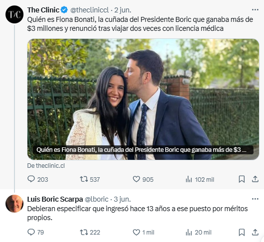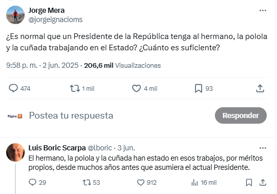 En ese contexto, Luis Boric utilizó su cuenta en X (ex Twitter) para respaldar a su nuera, subrayando su trayectoria en el sector público.