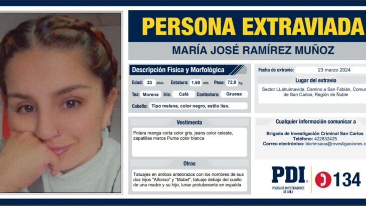Fue hace casi nueve meses cuando se reportó la desaparición de María José Ramírez Muñoz, mujer de 33 años que fue vista por última vez en San Carlos (Región del Ñuble).
