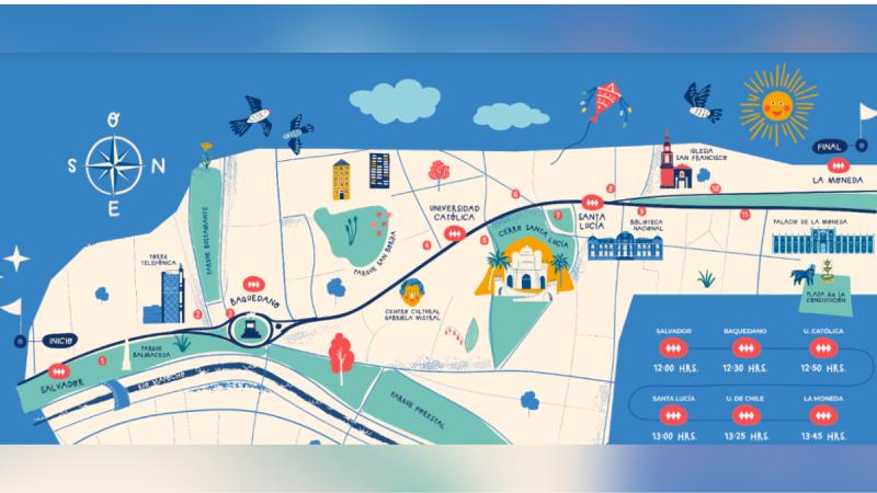 El desfile comenzará a las 12:00 horas en Avenida Providencia, a la altura de Avenida Salvador, y continuará por la Alameda pasando por Plaza Italia, Cerro Santa Lucía y Universidad de Chile, hasta llegar al sector de La Moneda.