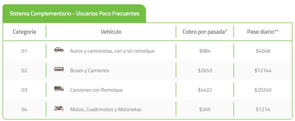 De acuerdo a la firma, este sistema complementario “deberá ser aplicado a usuarios poco frecuentes que hayan transitado, en un día calendario, por uno o los dos pórticos de cobro de la concesión en una ocasión por sentido, aplicándose la tarifa de Cobro por Pasada de acuerdo con lo establecido en las Bases de Licitación por cada tránsito”.