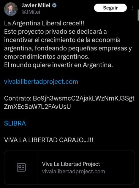 “El mundo quiere invertir en Argentina. $LIBRA”, decía el tuit del mandatario, publicado el pasado viernes.