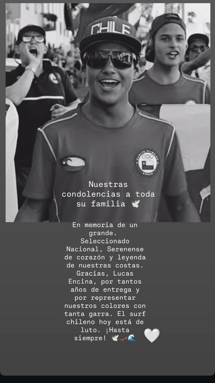 “Fue protagonista del circuito chileno por varios años y fiel representante del surf de La Serena-Coquimbo. Siempre te recordaremos, Lucas… Buenas olas”, expresaron con profundo dolor.