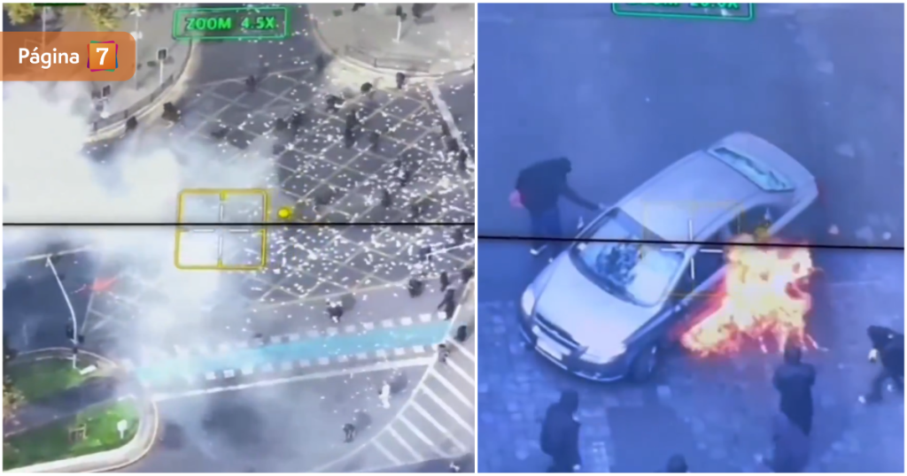En las imágenes compartidas por Carabineros en X, se aprecia cómo encapuchados lanzan piedras y artefactos incendiarios contra personal de Control del Orden Público (COP).