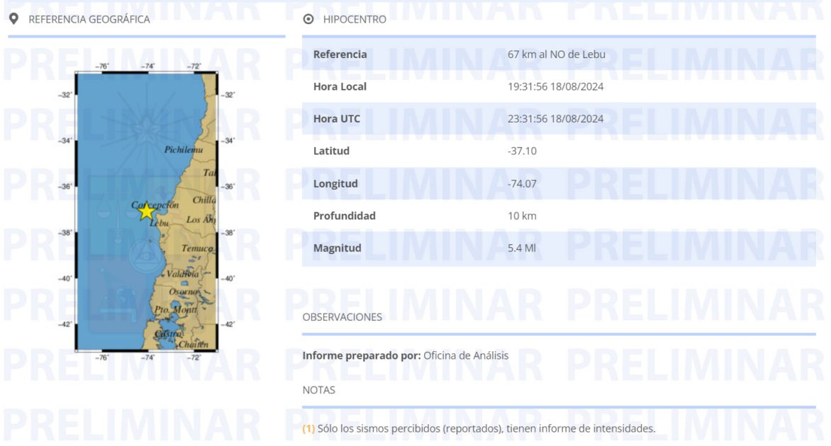 Según información del Centro Sismológico Nacional, se trata de un temblor que tuvo epicentro a 67 km al noroeste de Lebu, en la provincia de Arauco.