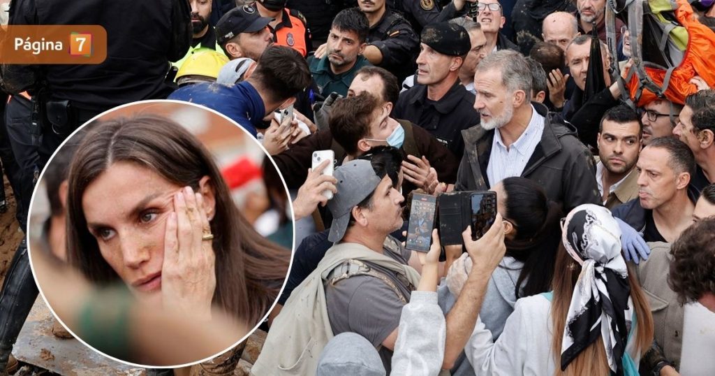 Cientos de voluntarios y vecinos, al ver a la comitiva, interrumpieron la limpieza de calles y sótanos, lanzando lodo y gritando “fuera, fuera”.