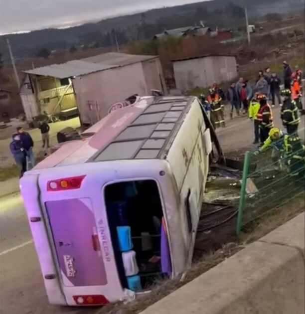 Durante la mañana de este viernes, un bus con 28 pasajeros volcó en la Ruta 160, a la altura del ingreso sur de Carampangue, en la comuna de Arauco, región del Bío Bío.