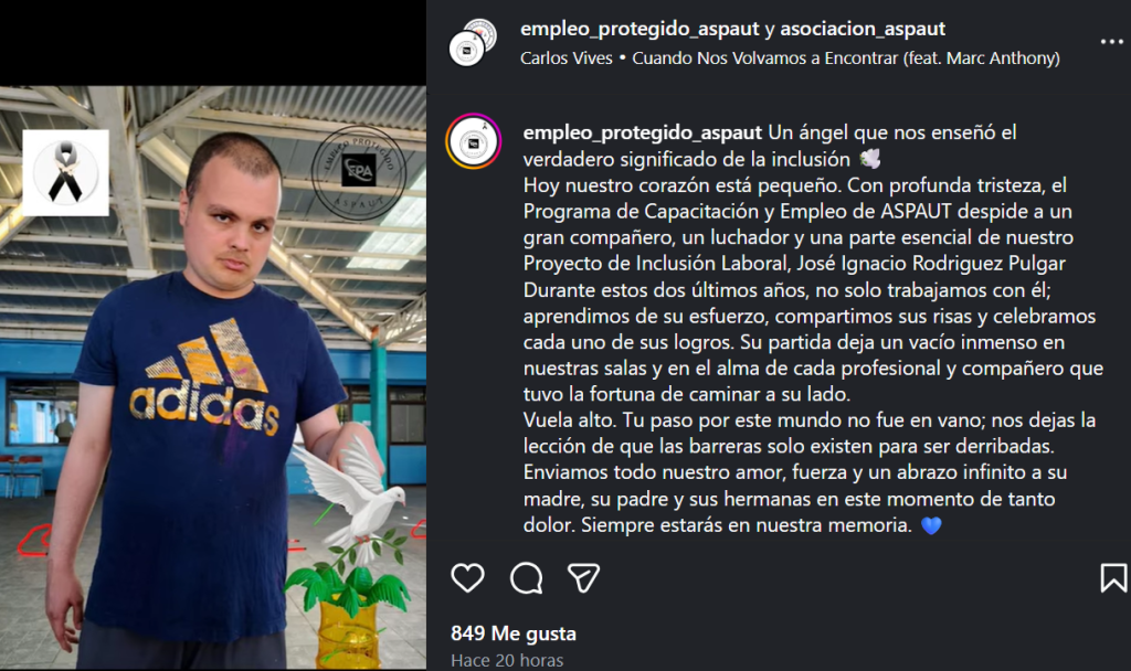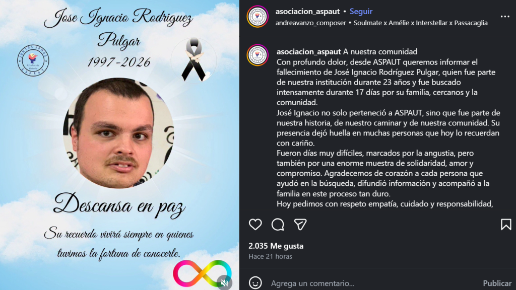 “Con profundo dolor, desde ASPAUT queremos informar el fallecimiento de José Ignacio Rodríguez Pulgar, quien fue parte de nuestra institución durante 23 años y fue buscado intensamente durante 17 días por su familia, cercanos y la comunidad”, señalaron en la publicación.