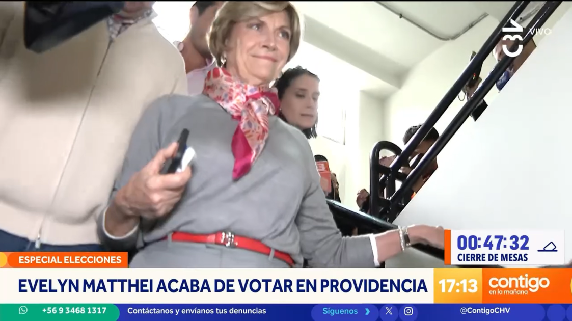 A eso de las 17:00 horas de este domingo, Evelyn Matthei llegó al Instituto Profesional DUOC en Providencia para sufragar en las Elecciones Presidenciales 2025.