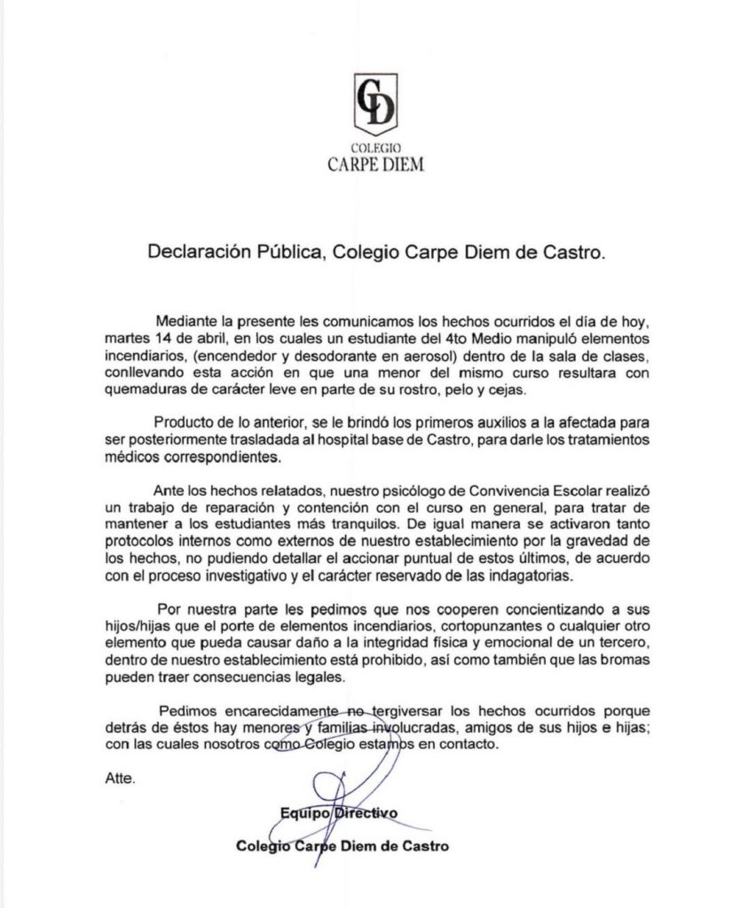 Además, especificaron que el protagonista del hecho fue un estudiante de cuarto medio, quien causó “quemaduras de carácter leve en parte del rostro, pelo y cejas” de su compañera.