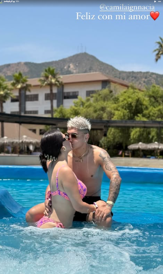 “Feliz con mi amor”, indicó en la postal donde aparecen besándose en una piscina. La joven, por su parte, también replicó la historia, con un “Te amo”.