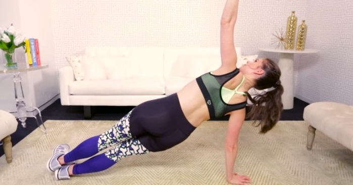 Ponte en posición de plancha, flexiona hacia el suelo y luego carga el peso de tu cuerpo en un brazo y las piernas inclinadas hacia el mismo lado. Ve alternando de lado a lado. Esta posición refuerza el pecho, tríceps y tu centro, estilizando tu figura.