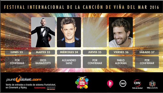 “Ya están a la venta los tickets para Ramazzotti (23/02)), Sanz (24/02) y Alborán (26/02) en @puntoticket #viña2016CHV”, escribió la cuenta de Instagram del Festival de Viña.