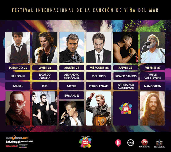 A través de su cuenta de Twitter, la alcadesa Virginia Reginato confirmó el día en el que se presentará cada artista en la Quinta Vergara, donde Luis Fonsi será el encargado de abrir el show, mientras que Cat Stevens lo cerrará.