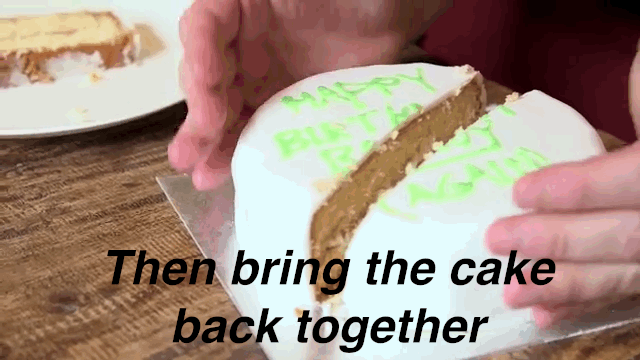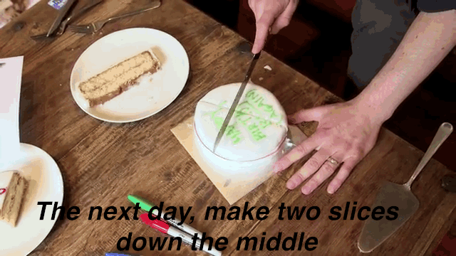 Para lograrlo, debes cortar dos líneas paralelas, del grosor que te interese, justo al medio de la torta. Después de sacarlos, basta que acerques ambos pedazos de la torta y ¡magia! Tienes una torta redonda de nuevo.