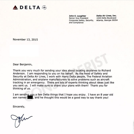 Al recibir la carta, el vicepresidente de Seguridad de Delta, John E. Laughter, no dudó en responderle a Ben e, incluso, le envió regalos de la aerolínea como premio a su esfuerzo y dedicación.