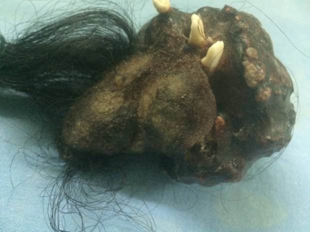 Tras ser examinado los médicos descubrieron que el joven indio tenía un quiste de 2,5 kilos de peso, y cuya masa incluía también pelo, huesos e incluso dientes.