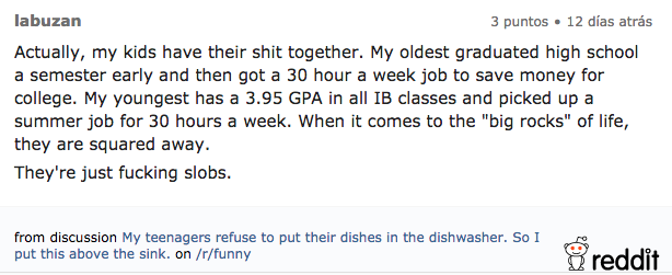 En los comentarios de Reddit explicó que sus hijas no eran unas irresponsable, pero sí eran algo “dejadas” con las tareas del hogar: “La mayor se graduó de la escuela secundaria un semestre antes y después consiguió un trabajo de 30 horas a la semana para ahorrar dinero para la universidad. La menos tiene un grado académico de 3.95 en todas las clases IB, y tomó un trabajo de verano durante 30 horas a la semana”, explicó.