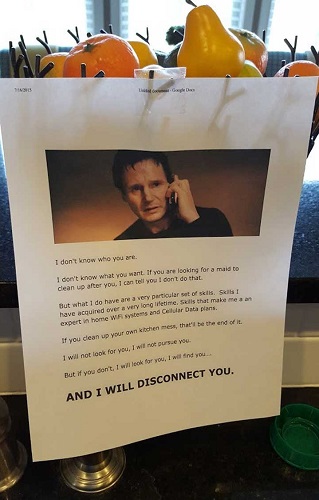 Este explicó que: “Mis hijas adolescentes se niegan a poner sus platos en el lavavajillas. Así que puse esta nota encima del fregadero”. En esta, se podía ver una imagen de Liam Neeson actuando en Búsqueda Implacable, justo en la escena en la que pronunciaba estas famosas palabras: