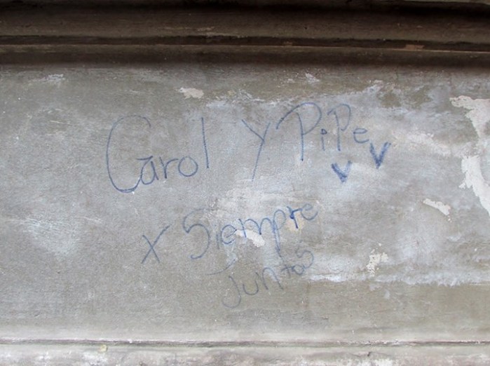 “Bueno, acá estamos limpiando (en realidad es nuestro querido Juan Alejandro Soto Bustos) el rayado de Carol y Pipe. Esperamos de todo corazón dos cosas: la primera, que quienes nos visiten mantengan una buena conducta y que cuiden nuestro edificio que es patrimonio de todos, y la segunda es que Carol y Pipe sean felices, coman perdices y que en lo posible usen otros medios para comunicar cuánto se quieren. Saludos a todos, Equipo MNHN”.