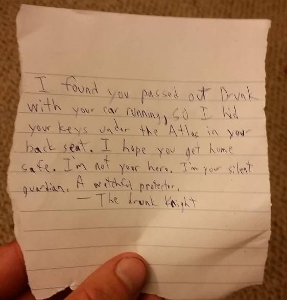 Al despertar, se encontró con una botella de agua y un mensaje que decidió compartir con las redes sociales. La nota que le dejaron decía: “Te encontré desmayado por el alcohol y con tu auto andando, así que escondí tus llaves bajo el atlas en tu asiento trasero. Espero que llegues a tu hogar seguro. No soy tu héroe, soy tu guardián silencioso. Un protector que todo lo ve. El caballero de los ebrios”.