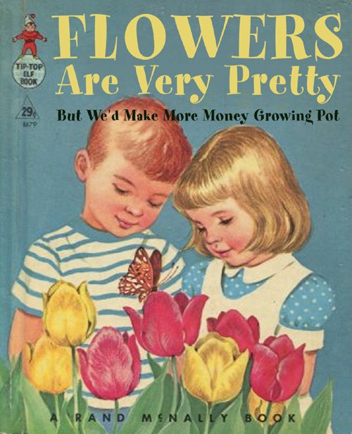 Ojo con este libro, se titulo todos amamos las flores y tiene a dos pequeños oliendo bellas plantas en portada, sin embargo si les bien, el ingenioso título no termina ahí, sino que continúa con pero ganamos más dinero cultivando marihuana! Creativo, pero inapropiado, sobre todo por los niños.