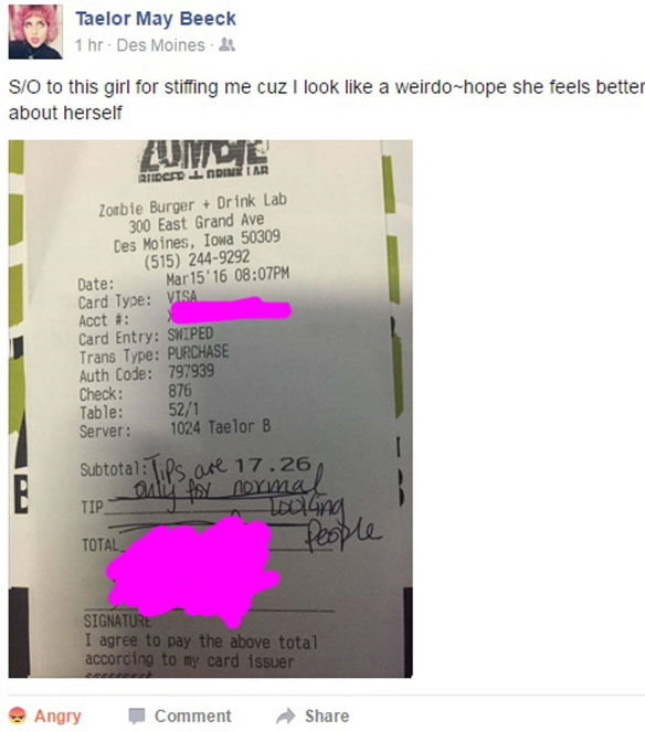 El hecho ocurrió en un restaurant de la ciudad de Des Moines, en Iowa, Estados Unidos, donde Taelor May Beck trabaja como mesera. Allí, fue discriminada por una clienta que no quiso dejarle propina simplemente porque le parecía que no era una persona “normal”.