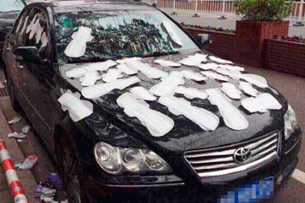 En China, otra dama cubrió el vehículo de su pareja, aquella vez con toallitas higiénicas, porque pensó que le era infiel.