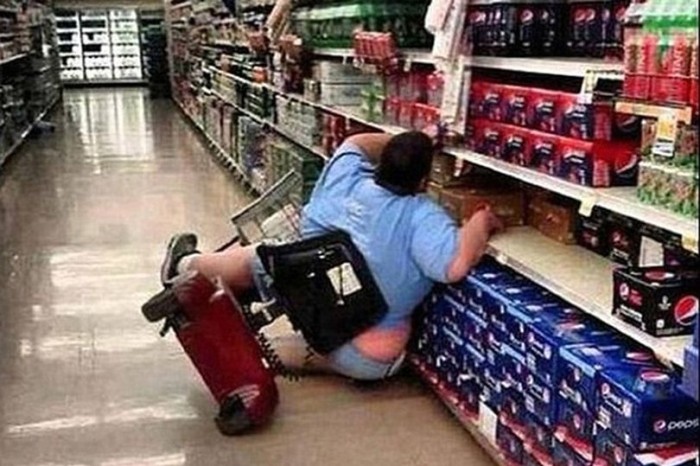 En la imagen se ve como ella, una madre de 39 años, discapacitada por un problema lumbar y con obesidad producto de patologías psicológicos causadas por su enfermedad física, se cae de un carrito para personas con capacidades distintas en el pasillo de un supermercado.