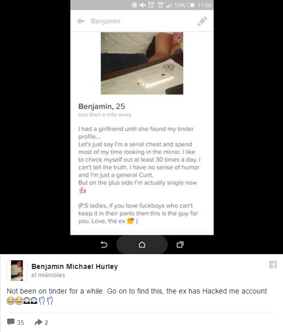 Y es que su ex le hizo un flaca favor, cuando pilló su perfil activo pese a estar saliendo con ella. Tal fue su enojo, que decidió editar la descripción del joven en su perfil de Tinder, lo que al parecer es vital para recibir un “like”.