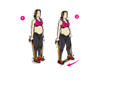 Aguanta en esta posición durante 30 segundos y luego presiona la banda echando el pie adelante cinco segundos. Repite el ejercicio con la otra pierna, tal y como se muestra a continuación: