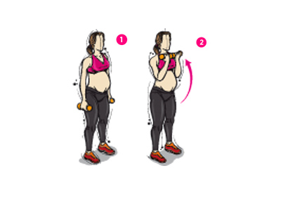 Ponte de pie, con las piernas separadas al ancho de los hombros y con una mancuerna ligera en cada mano. Flexiona los brazos, acercando las pesas a los hombros y manteniendo los codos pegados al cuerpo. Repite este ejercicio unas 10 veces.