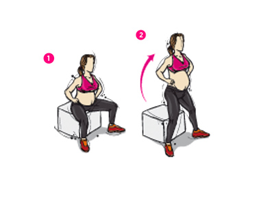Siéntate en el borde de una silla con las piernas abiertas y la espalda recta. Haz fuerza con las piernas para ponerte en pie, echando el cuerpo hacia adelante. Mantén las rodillas ligeramente flexionadas y completa dos series de 10 repeticiones del ejercicio.