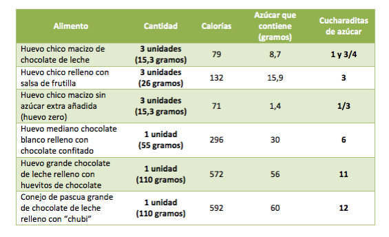 Como pueden ver, el aporte de azúcar de los chocolates puede sobrepasar en exceso las recomendaciones diarias en caso que no exista control. El consumo de este alimento debe ser en forma excepcional y nunca en forma diaria, ya que sus componentes pueden generar sobrepeso –obesidad y otras enfermedades asociadas.