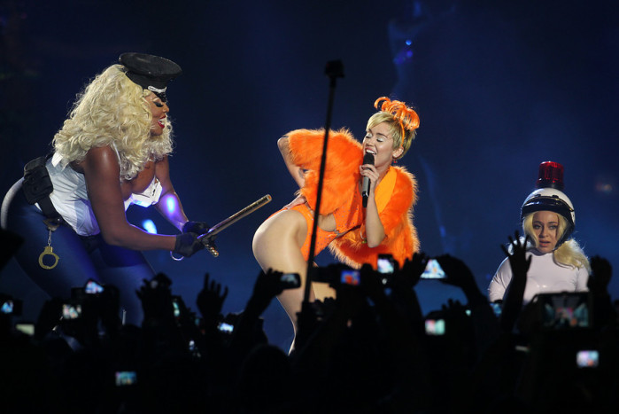 Según informó Publimetro, Miley Cyrus nuevamente presentó un show excesivamente erótico, que indignó a muchos de los padres que acompañaron a sus hijos. Traseros gigantes, muñecos, osos de peluche y plátanos inflables fueron parte de la utilería. Incluso, le tiró agua con la boca a los extasiados asistentes.  Pero fue la aparición de una particular figura inflable la que encendió la ira de los adultos: