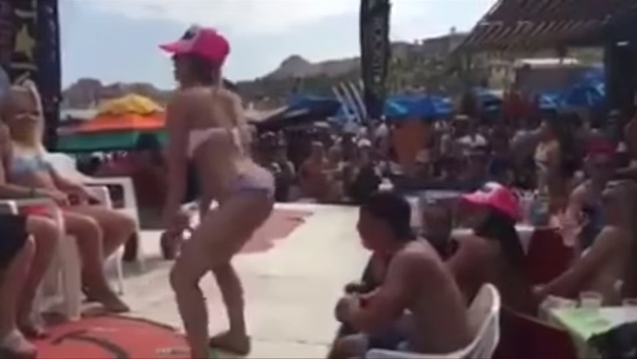 Disfrutando del calor, la playa y las bebidas, la joven maestra simplemente sigue el juego y danza eróticamente frente a los ojos de cientos de turistas, sin imaginar que el video capturado le costaría su empleo.