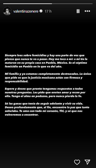 A través de su cuenta de Instagram, la actriz expresó su dolor. “Siempre leés sobre feminicidios y pensás que nunca te va a pasar. Hoy me toca a mí: a mi tía la mataron en su propia casa en Puebla, México. Es el séptimo feminicidio en Puebla en lo que va del año”, escribió.