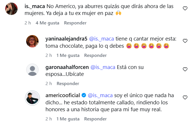 Sin embargo, el intercambio más tenso ocurrió cuando una mujer criticó directamente al artista. “No, Américo, ya aburres. Quizás qué dirás ahora de las mujeres. Ya deja a tu exmujer en paz”, escribió la internauta.