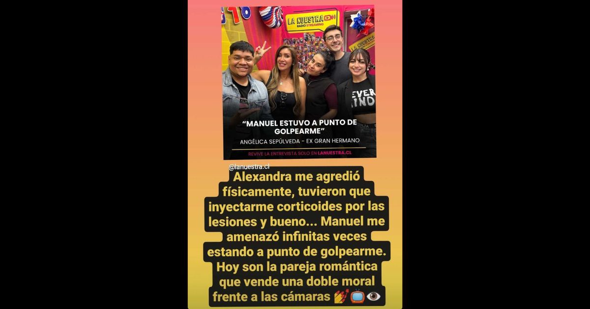 Además, en sus historias de Instagram, Angélica Sepúlveda aseguró que “Alexandra me agredió físicamente, tuvieron que inyectarme corticoides por las lesiones. Manuel me amenazó infinitas veces estando a punto de golpearme”.