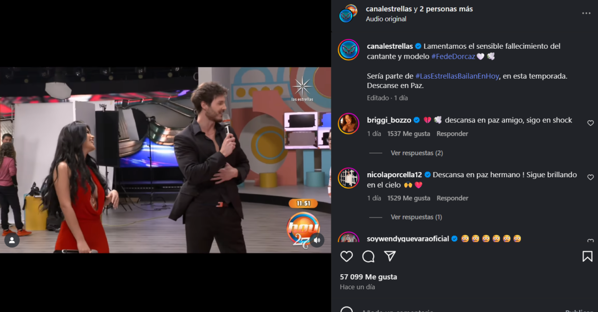 “La familia de Hoy lamenta el sensible fallecimiento de nuestro amigo y compañero, Fede Dorcaz. Nos unimos al dolor que embarga a toda su familia, a sus papás y a su novia Mariana Ávila”, empezó diciendo el programa.