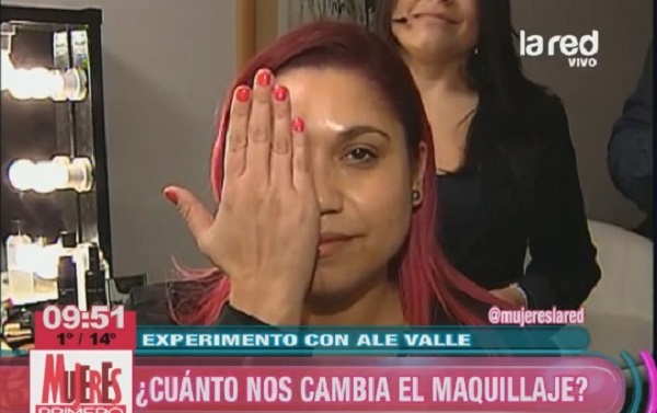 Para demostrar el aporte de los cosméticos en la apariencia femenina, “Ale” Valle se puso en manos de la maquilladora Glenda Barra, quien trabajó sobre la mitad de su rostro. La otra quedó al natural.